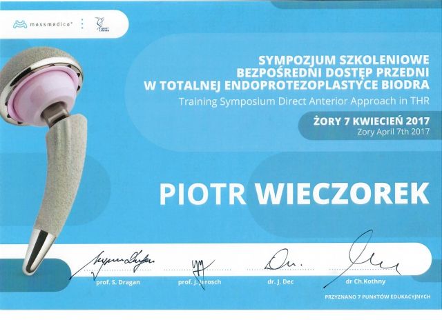 W związku z tym 7 kwietnia 2017 r. w Żorach odbyło się sympozjum dotyczące wymiany stawu biodrowego z małoinwazyjnego bezpośredniego dostępu przedniego z użyciem implantu MiniHip™ zorganizowane przez firmę Massmedica. Wśród uczestników znalazł się lek. Piotr Wieczorek.